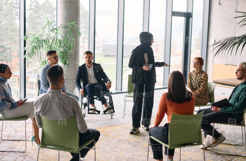 Корпоративная встреча бизнес-команды с менеджером или тренером. Группа счастливых разнообразных, многорасовых людей, сидящих в кругу
