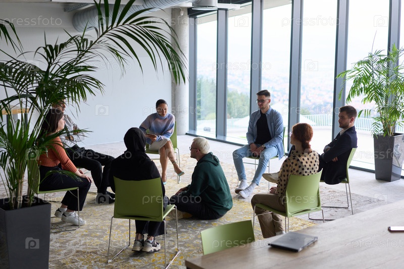 Корпоративная встреча бизнес-команды с менеджером или тренером. Группа счастливых разнообразных, многорасовых людей, сидящих в кругу