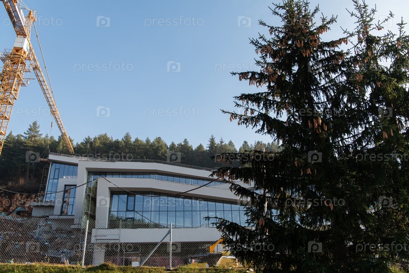 Снаружи строящееся деловое здание окружено грузовиками, кранами и различными строительными материалами, создавая оживленную сцену обширной промышленной строительной площадки