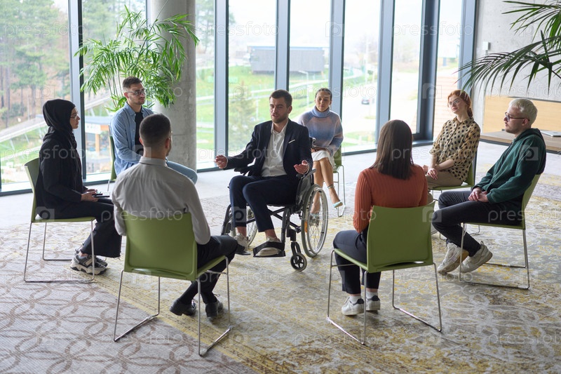 Корпоративная встреча бизнес-команды с менеджером или тренером. Группа счастливых разнообразных, многорасовых людей, сидящих в кругу
