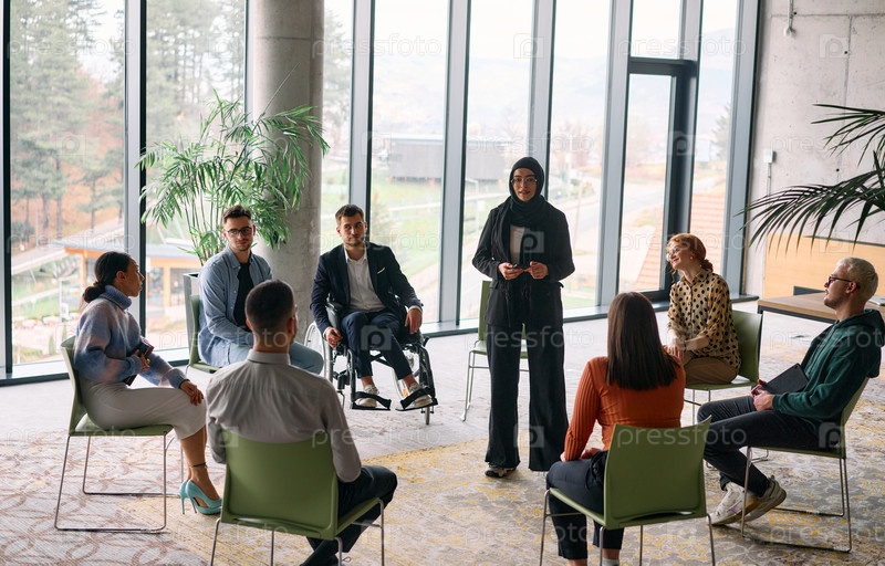 Корпоративная встреча бизнес-команды с менеджером или тренером. Группа счастливых разнообразных, многорасовых людей, сидящих в кругу