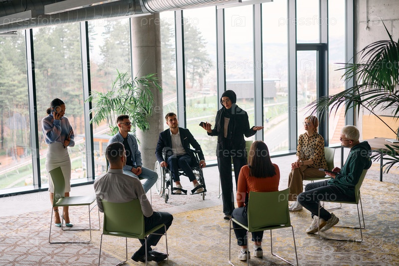 Корпоративная встреча бизнес-команды с менеджером или тренером. Группа счастливых разнообразных, многорасовых людей, сидящих в кругу