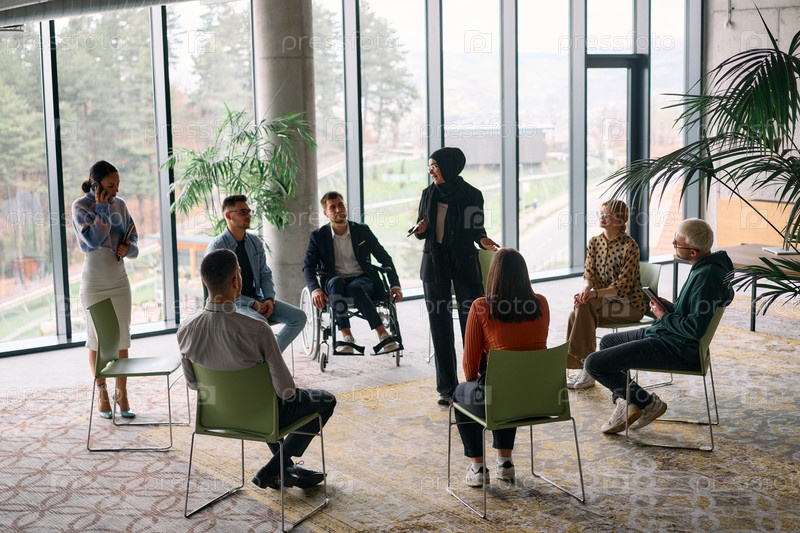 Корпоративная встреча бизнес-команды с менеджером или тренером. Группа счастливых разнообразных, многорасовых людей, сидящих в кругу