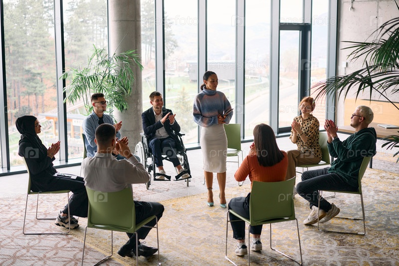 Корпоративная встреча бизнес-команды с менеджером или тренером. Группа счастливых разнообразных, многорасовых людей, сидящих в кругу