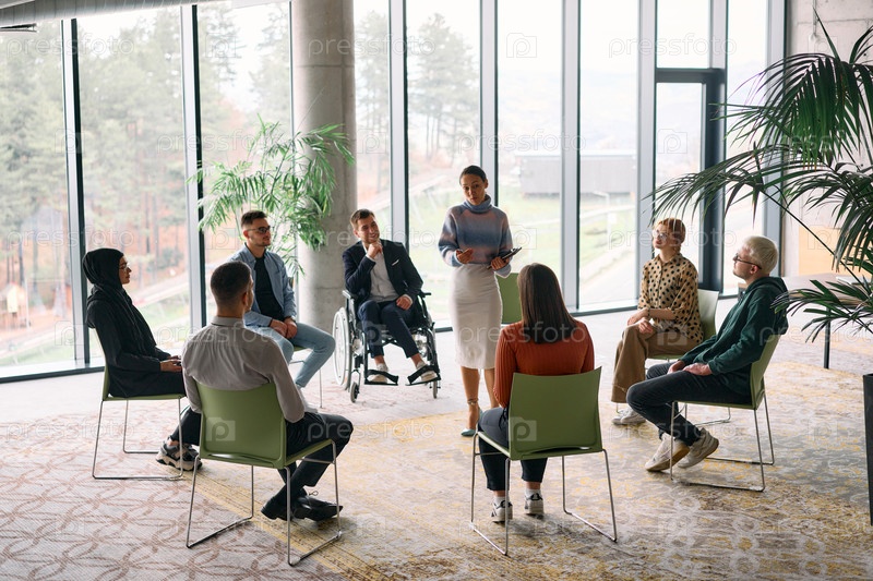 Корпоративная встреча бизнес-команды с менеджером или тренером. Группа счастливых разнообразных, многорасовых людей, сидящих в кругу