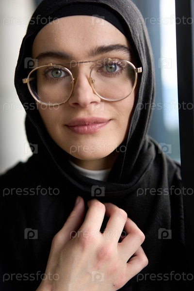 Великолепная мусульманка-бизнесвумен запечатлена на портрете крупным планом, демонстрируя свои пленительные зеленые глаза за стильными очками, излучающими элегантность и уверенность