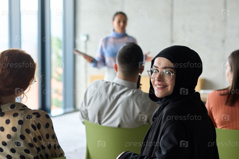 Группа разнообразных деловых людей сосредоточенно сидит в современном офисе, активно участвуя в обучающем занятии под руководством инструктора, уделяя особое внимание последним технологическим достижениям в мире бизнеса