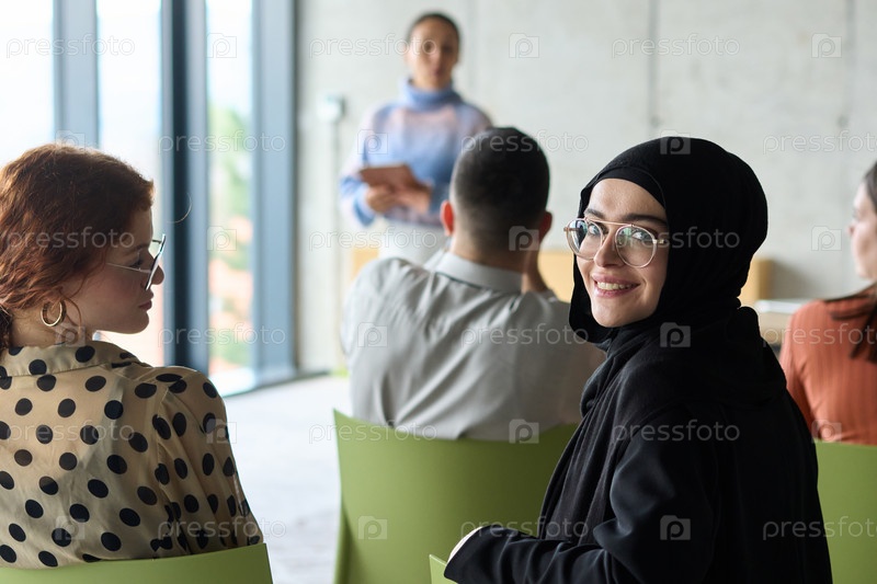 Группа разнообразных деловых людей сосредоточенно сидит в современном офисе, активно участвуя в обучающем занятии под руководством инструктора, уделяя особое внимание последним технологическим достижениям в мире бизнеса