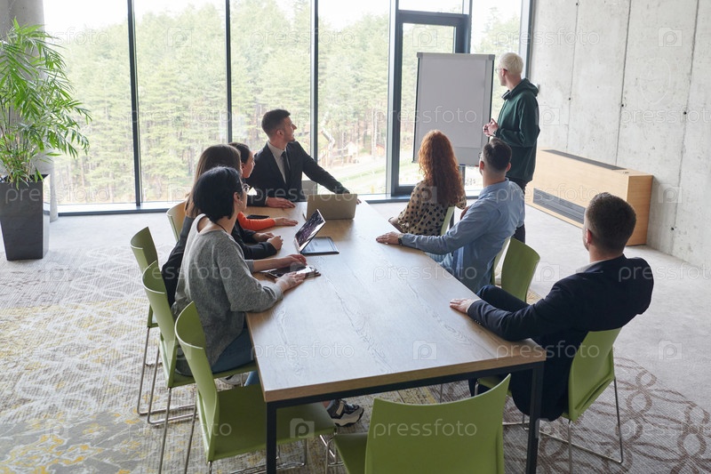 Разнообразная многонациональная бизнес-команда участвует в совместной встрече, обсуждая стратегии и решения в современной офисной обстановке