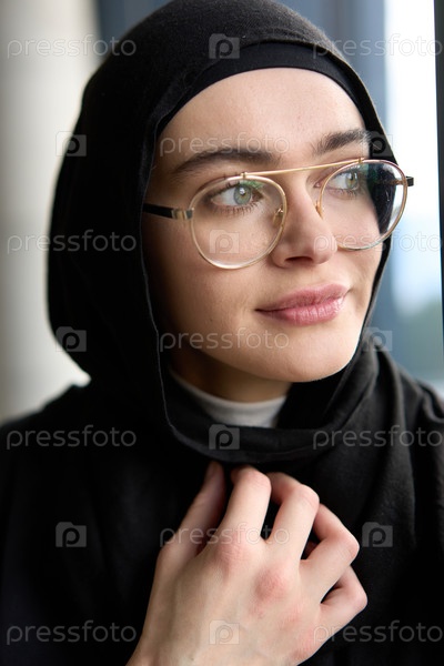 Великолепная мусульманка-бизнесвумен запечатлена на портрете крупным планом, демонстрируя свои пленительные зеленые глаза за стильными очками, излучающими элегантность и уверенность