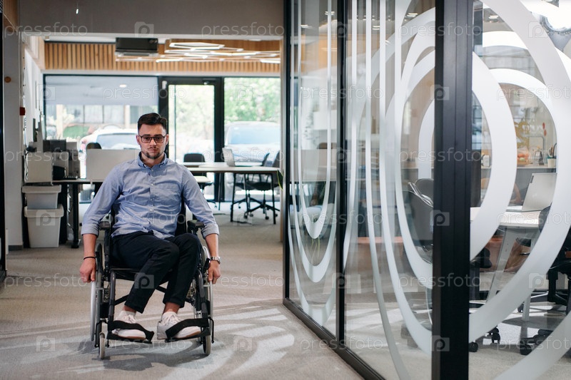 В крупной современной корпорации решительный бизнесмен в инвалидной коляске движется по коридору, олицетворяя расширение прав и возможностей и инклюзивность в корпоративном мире