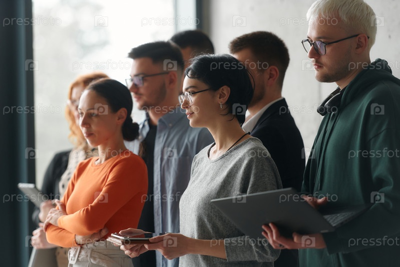 Группа успешных профессионалов бизнеса собралась в офисе, излучая единство, уверенность и общую приверженность успеху и инновациям