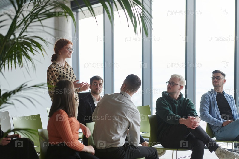 Группа разнообразных деловых людей сосредоточенно сидит в современном офисе, активно участвуя в обучающем занятии под руководством инструктора, уделяя особое внимание последним технологическим достижениям в мире бизнеса