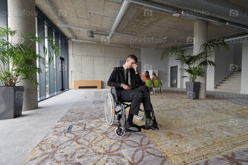 Грустный и подавленный директор в инвалидном кресле сидит один в большом офисе, размышляя о трудностях и изоляции, которые сопутствуют его профессиональным обязанностям