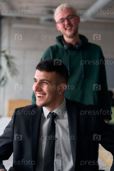 Сотрудник развлекает директора в инвалидной коляске, катаясь по офису со смехом и радостью