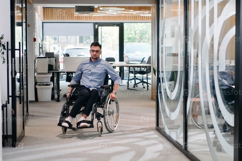 В крупной современной корпорации решительный бизнесмен в инвалидной коляске движется по коридору, олицетворяя расширение прав и возможностей и инклюзивность в корпоративном мире