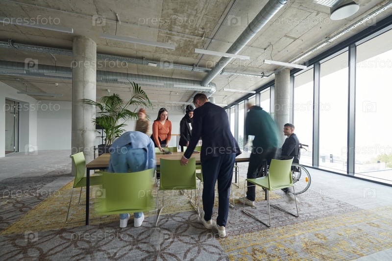 Бизнес-группа во главе с директором в инвалидной коляске готовится к встрече в современном офисе