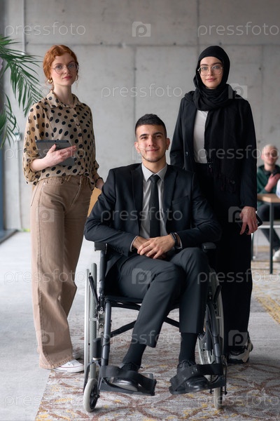 Разнообразная бизнес-команда уверенно позирует, включая улыбающегося директора, сидящего в инвалидном кресле, в окружении двух коллег-женщин, одна из которых в хиджабе, а другая держит планшет, в современной офисной обстановке