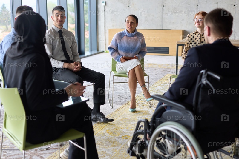 Корпоративная встреча бизнес-команды с менеджером или тренером. Группа счастливых разнообразных, многорасовых людей, сидящих в кругу