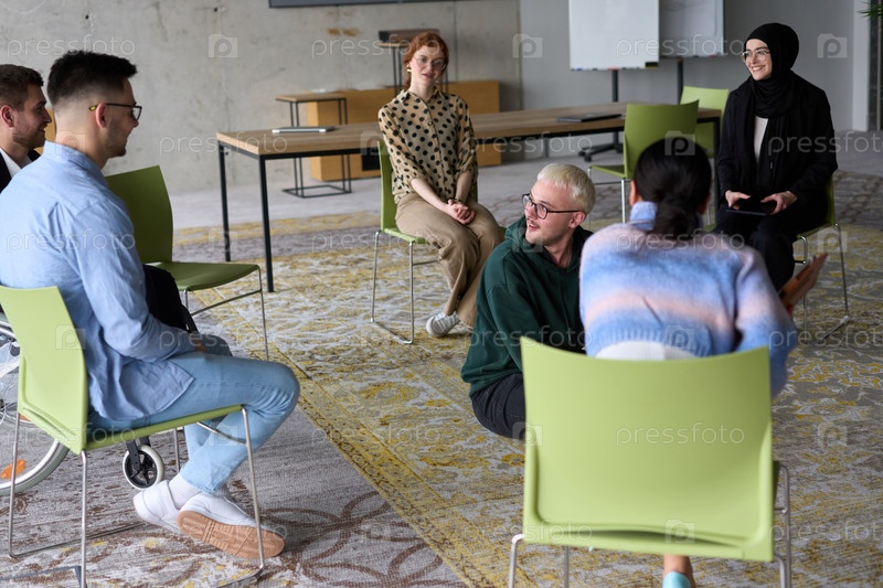 Корпоративная встреча бизнес-команды с менеджером или тренером. Группа счастливых разнообразных, многорасовых людей, сидящих в кругу