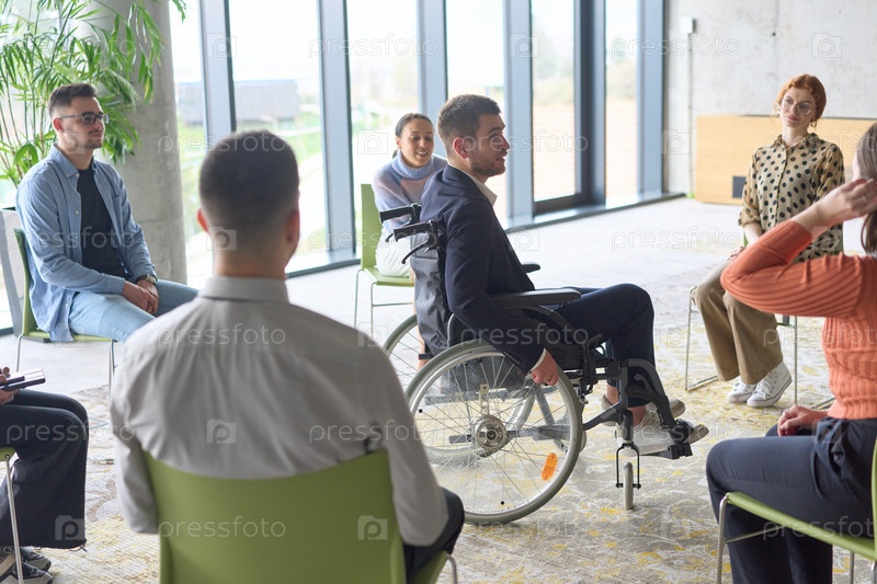 Корпоративная встреча бизнес-команды с менеджером или тренером. Группа счастливых разнообразных, многорасовых людей, сидящих в кругу