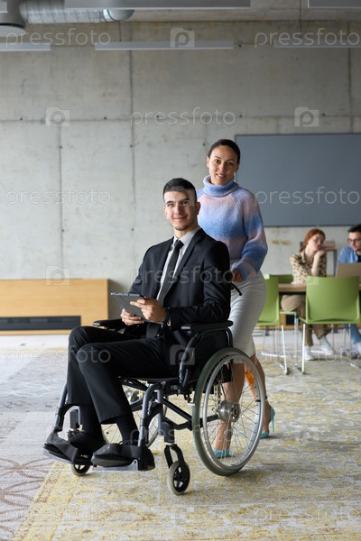 В деловой офисной обстановке деловая женщина помогает своему директору, который сидит в инвалидном кресле и пользуется планшетом, в то время как их коллеги сотрудничают на заднем плане