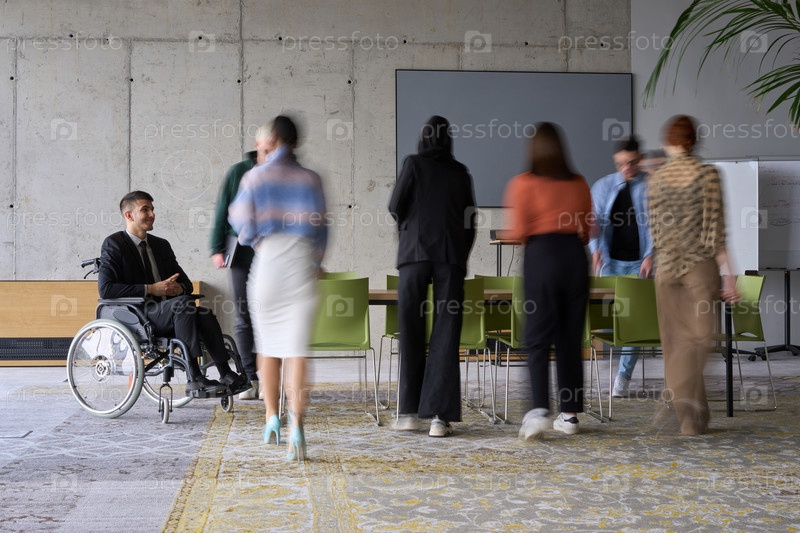 Разношерстная бизнес-команда, работающая в срочном порядке за столом переговоров, сотрудничает на совещании, в то время как их директор, сидя в инвалидном кресле, ждет их мнения