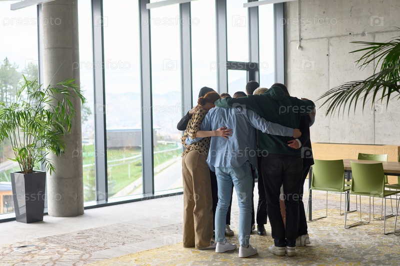 Группа разношерстных профессионалов стоит в кругу поддержки, обнимая друг друга в современном офисном помещении, залитом естественным светом