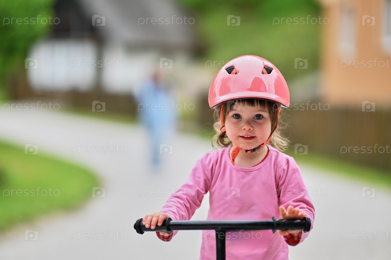 Маленькая девочка, одетая в милый наряд и в шлеме, с волнением учится кататься на велосипеде в первый раз, полная радости и решимости