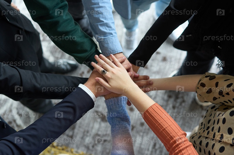 Вид сверху на деловых людей, взявшихся за руки в круг, символизирующий единство, сотрудничество и общий успех на рабочем месте