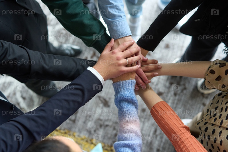 Вид сверху на деловых людей, взявшихся за руки в круг, символизирующий единство, сотрудничество и общий успех на рабочем месте