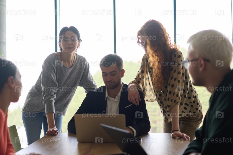 Разнообразная команда профессионалов в сфере бизнеса вместе с директором компании анализируют успехи бизнеса на ноутбуке в современном офисе, обсуждают стратегию и прогресс