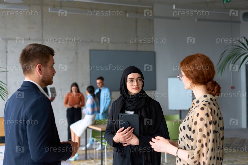 Группа разнообразных деловых людей ведет беседу во время рабочего перерыва в офисе, на заднем плане видны их коллеги, что способствует сотрудничеству и налаживанию связей