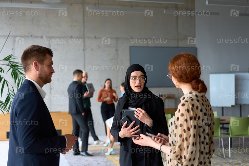 Группа разнообразных деловых людей ведет беседу во время рабочего перерыва в офисе, на заднем плане видны их коллеги, что способствует сотрудничеству и налаживанию связей