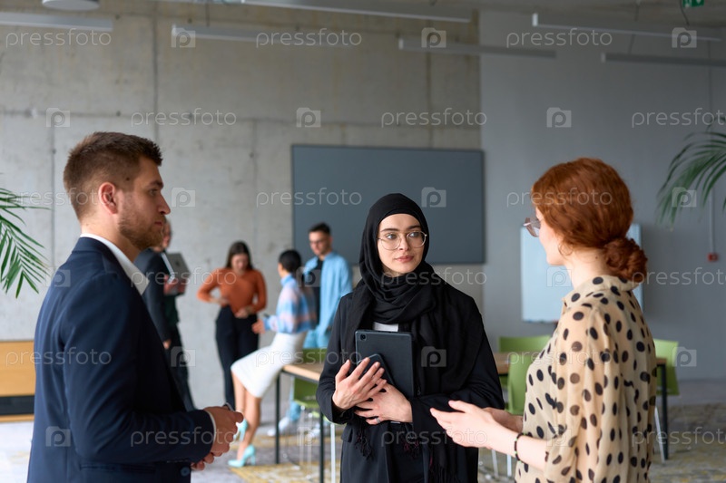 Группа разнообразных деловых людей ведет беседу во время рабочего перерыва в офисе, на заднем плане видны их коллеги, что способствует сотрудничеству и налаживанию связей