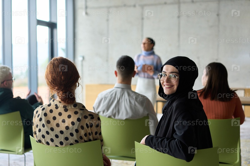 Группа разнообразных деловых людей сосредоточенно сидит в современном офисе, активно участвуя в обучающем занятии под руководством инструктора, уделяя особое внимание последним технологическим достижениям в мире бизнеса