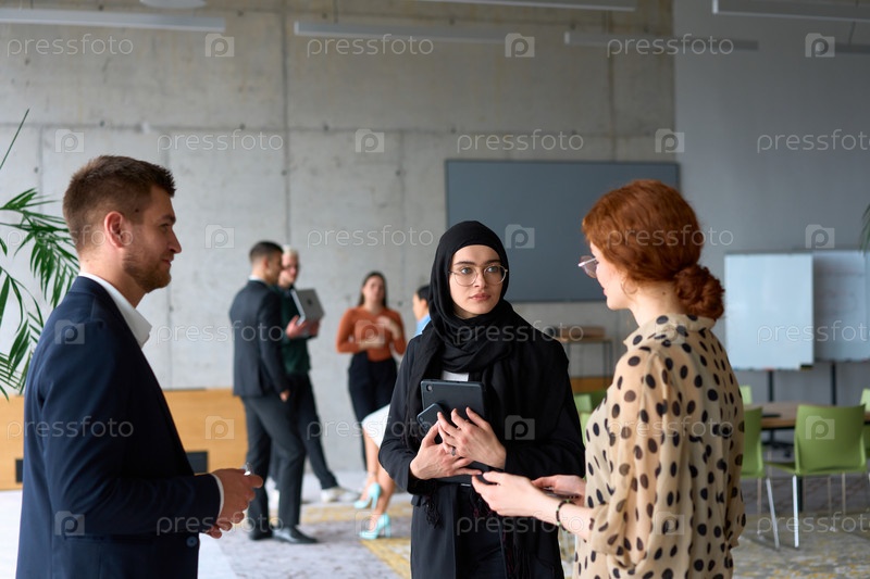 Группа разнообразных деловых людей ведет беседу во время рабочего перерыва в офисе, на заднем плане видны их коллеги, что способствует сотрудничеству и налаживанию связей