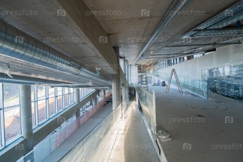 Захватывающий вид на строящееся современное деловое здание, демонстрирующее его грубый промышленный интерьер с открытыми стальными балками и бетонными стенами, залитыми теплыми золотистыми оттенками заката