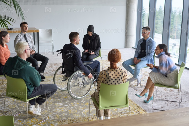 Корпоративная встреча бизнес-команды с менеджером или тренером. Группа счастливых разнообразных, многорасовых людей, сидящих в кругу