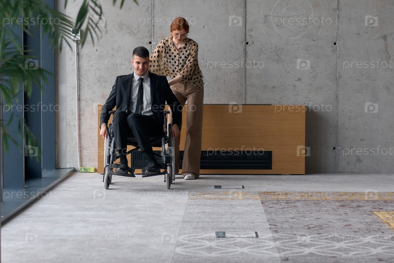 Директор в инвалидном кресле ведет деловую дискуссию с коллегой, перемещаясь по современному офису