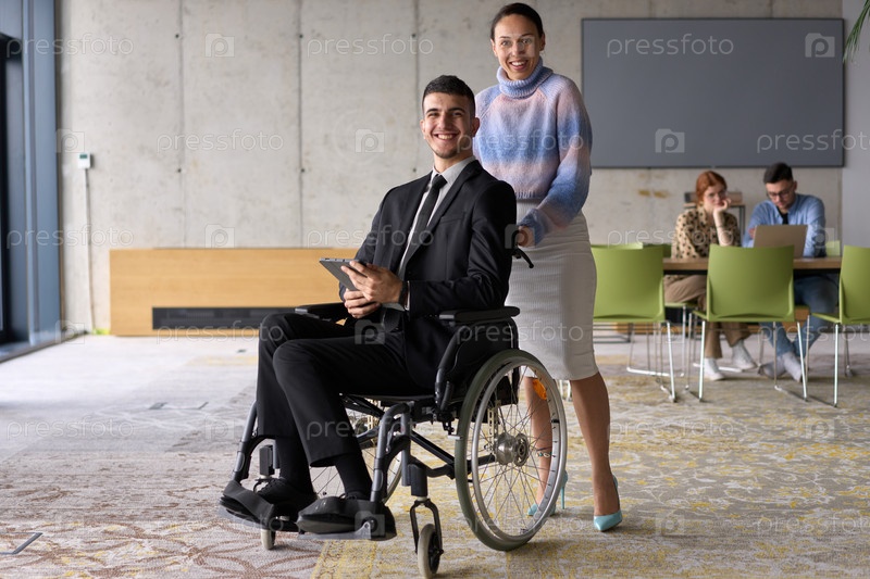 В деловой офисной обстановке деловая женщина помогает своему директору, который сидит в инвалидном кресле и пользуется планшетом, в то время как их коллеги сотрудничают на заднем плане