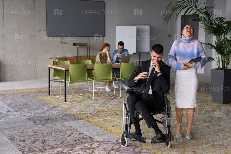 В деловой офисной обстановке деловая женщина помогает своему директору, который сидит в инвалидном кресле и пользуется планшетом, в то время как их коллеги сотрудничают на заднем плане