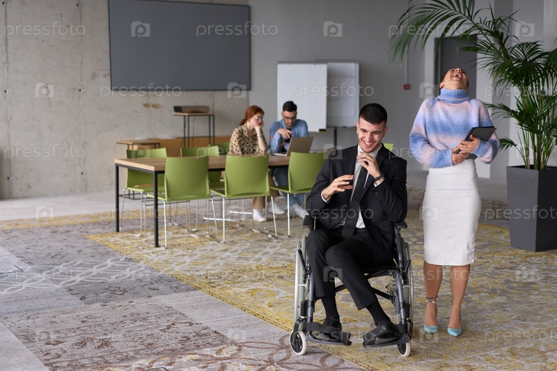 В деловой офисной обстановке деловая женщина помогает своему директору, который сидит в инвалидном кресле и пользуется планшетом, в то время как их коллеги сотрудничают на заднем плане