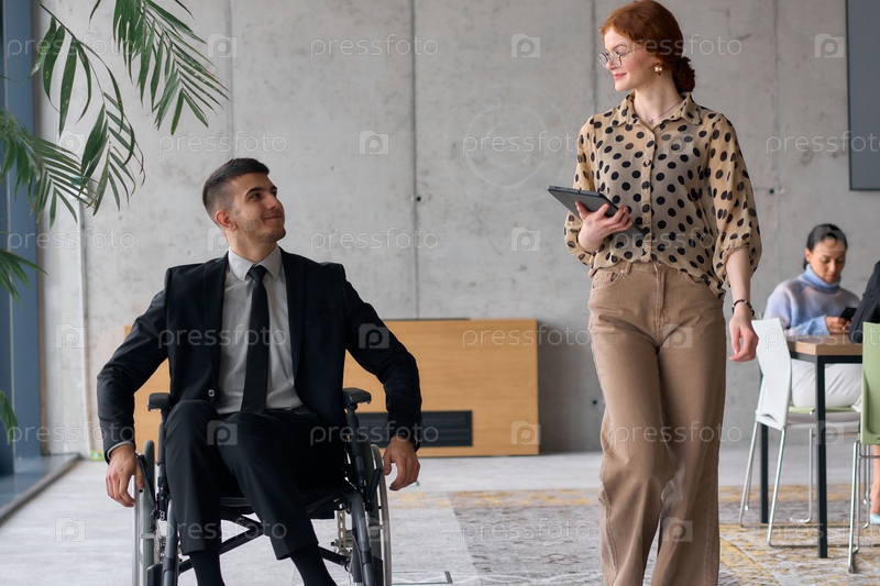 Директор в инвалидном кресле ведет деловую дискуссию с коллегой, перемещаясь по современному офису