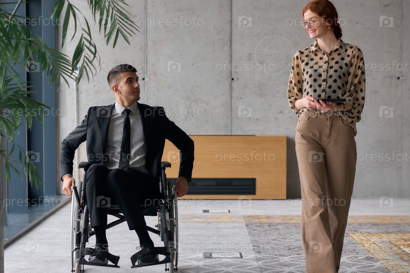 Директор в инвалидном кресле ведет деловую дискуссию с коллегой, перемещаясь по современному офису