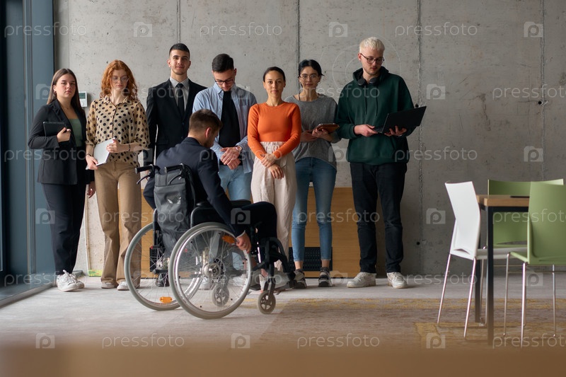 Многонациональная бизнес-команда сотрудничает в современном офисе с директором в инвалидной коляске