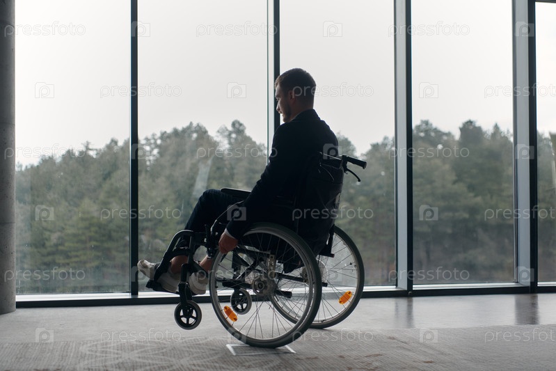 Бизнесмен в инвалидном кресле наслаждается моментом смеха у большого окна в современном офисе, олицетворяя позитив, стойкость и сбалансированный подход к работе и жизни