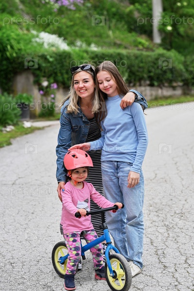Группа счастливых людей, в том числе две женщины, мальчик с мячом и маленькая девочка на беговеле в шлеме, наслаждаются активным отдыхом на мощеной дорожке, окруженной зеленью