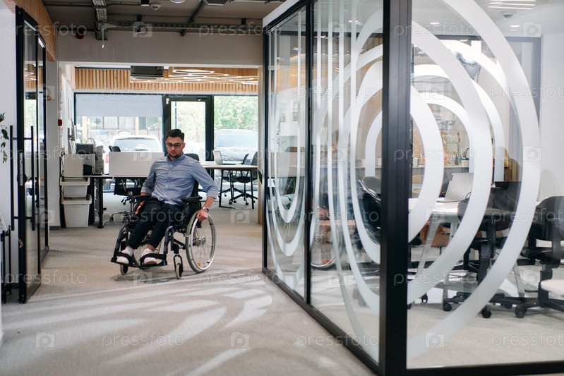 В крупной современной корпорации решительный бизнесмен в инвалидной коляске движется по коридору, олицетворяя расширение прав и возможностей и инклюзивность в корпоративном мире