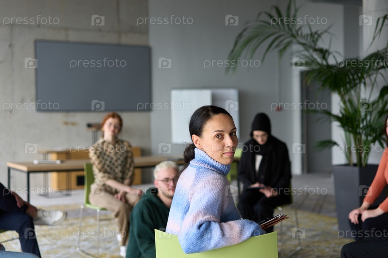 Группа разнообразных деловых людей сосредоточенно сидит в современном офисе, активно участвуя в обучающем занятии под руководством инструктора, уделяя особое внимание последним технологическим достижениям в мире бизнеса